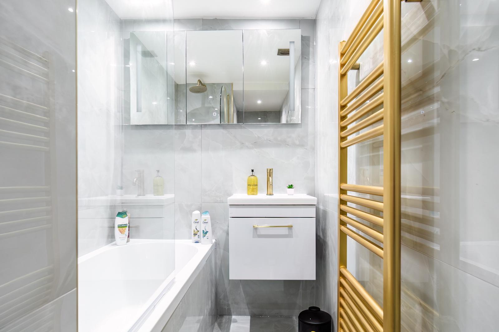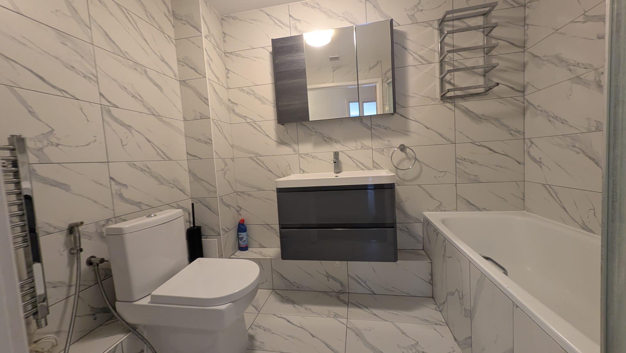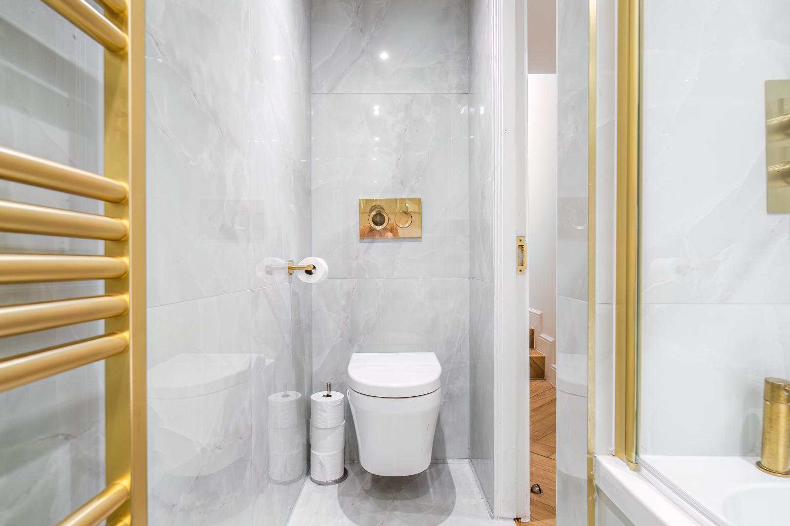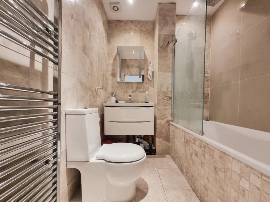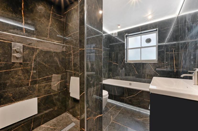 We reconfigured the layout for better flow, installed bespoke cabinetry, introduced marble tiling and underfloor heating, and upgraded to modern water-efficient fixtures.